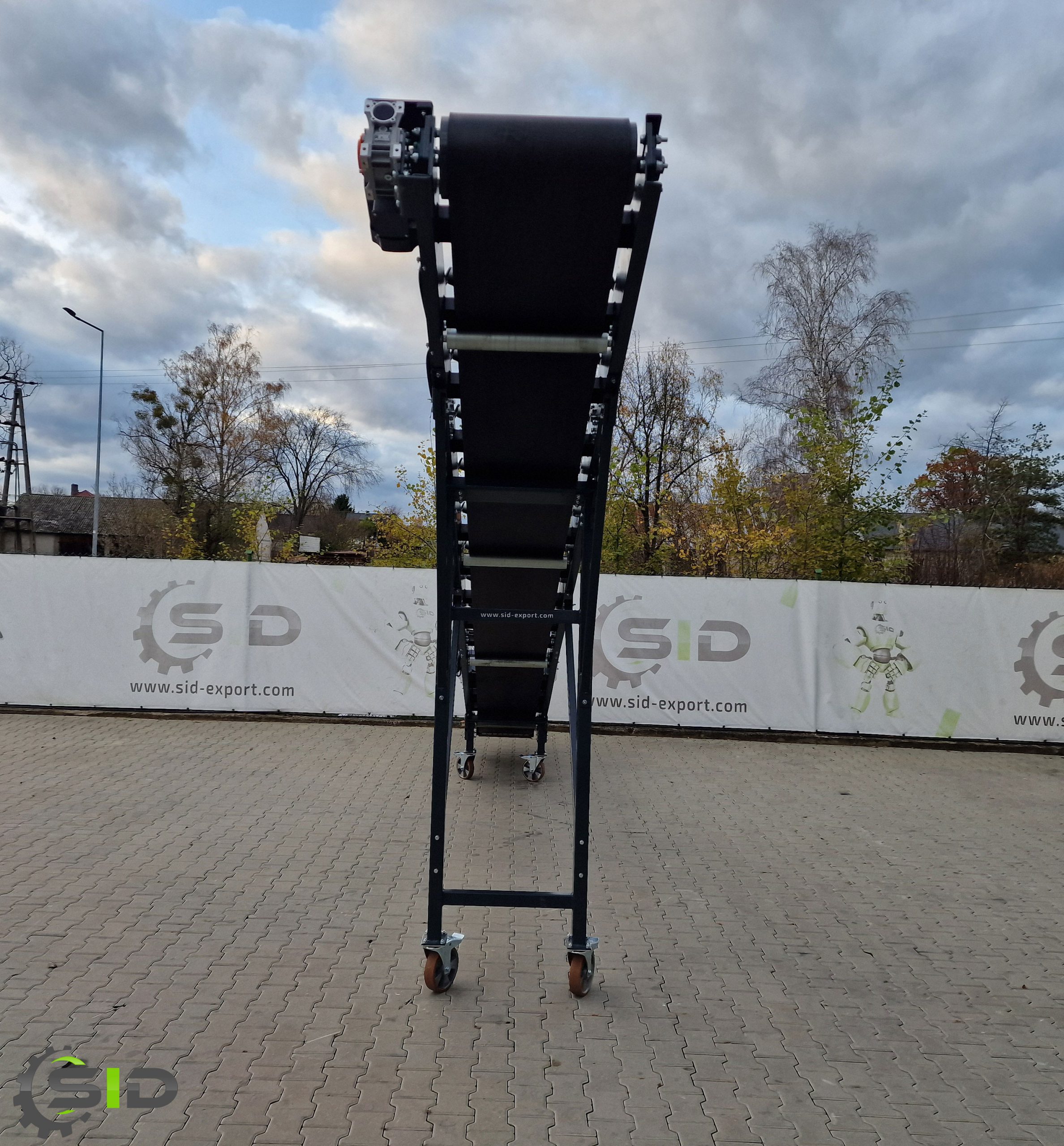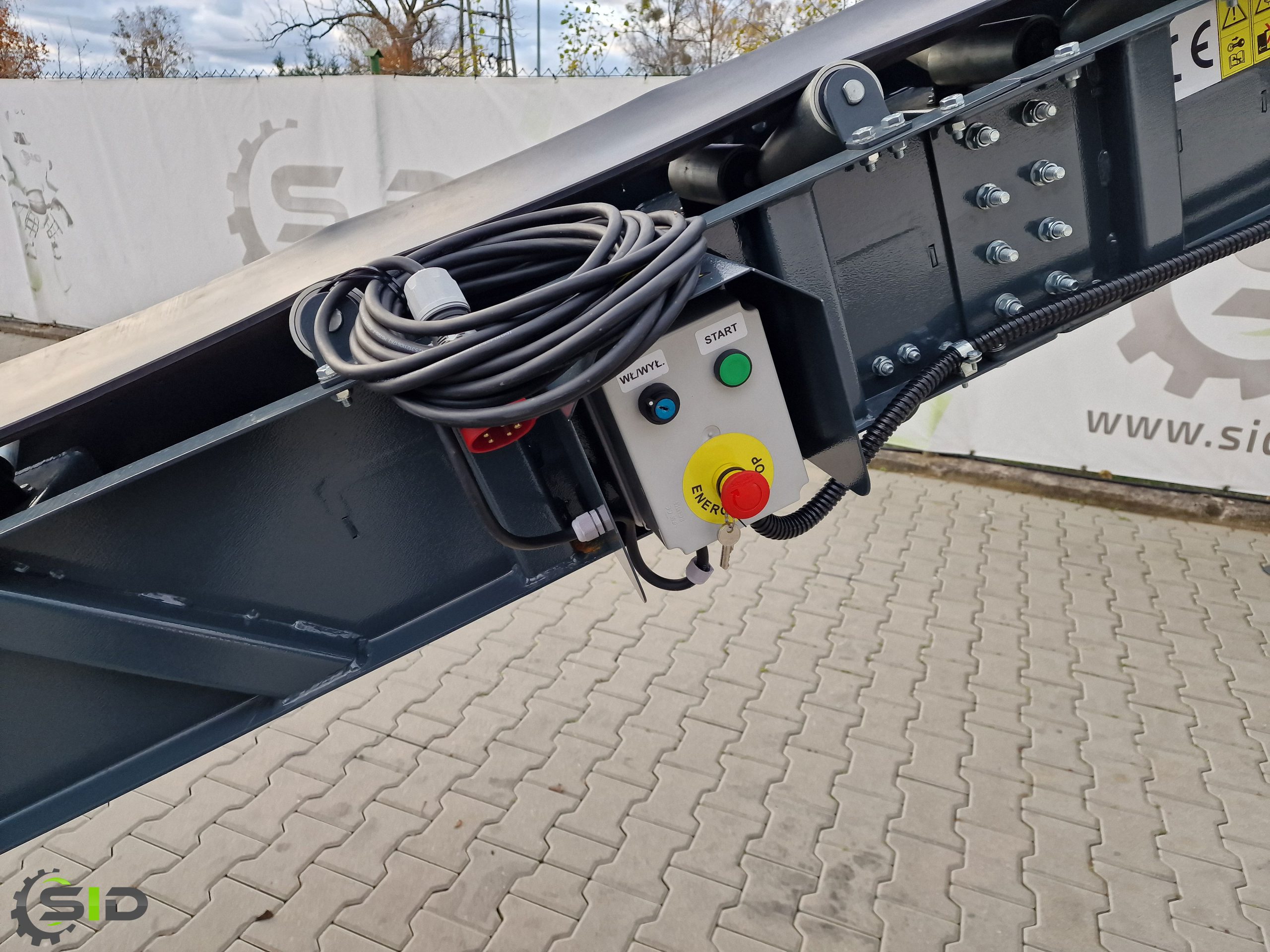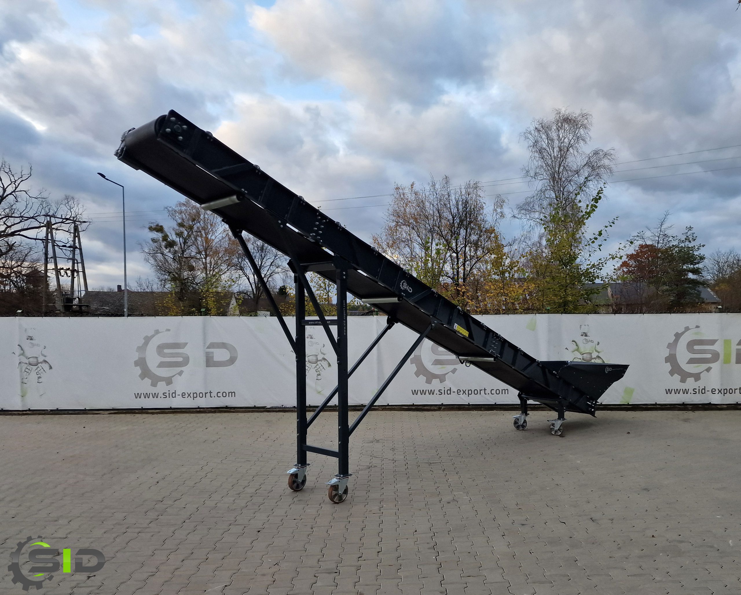 Kosz zasypowy wyposażony jest w dwie stabilne stopki boczne, które zapewniają pewne i bezpieczne ustawienie urządzenia w miejscu pracy. Dodatkowo zastosowano kółka transportowe, dzięki którym możliwe jest szybkie i łatwe przestawianie taśmociągu w dowolne miejsce – bez konieczności użycia specjalistycznego sprzętu.